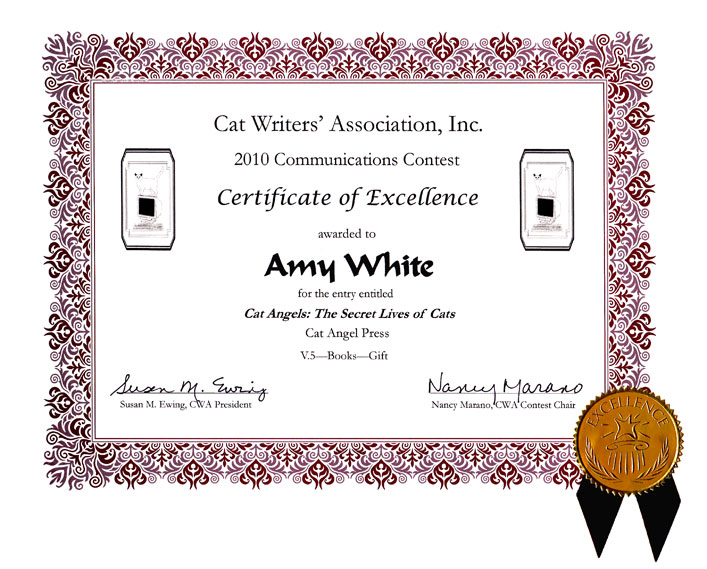 CAT ANGELS: The Secret Lives of Cats was selected by the Cat Writers Association Communications Contest judges as a 2010 Certificate of Excellence winner.