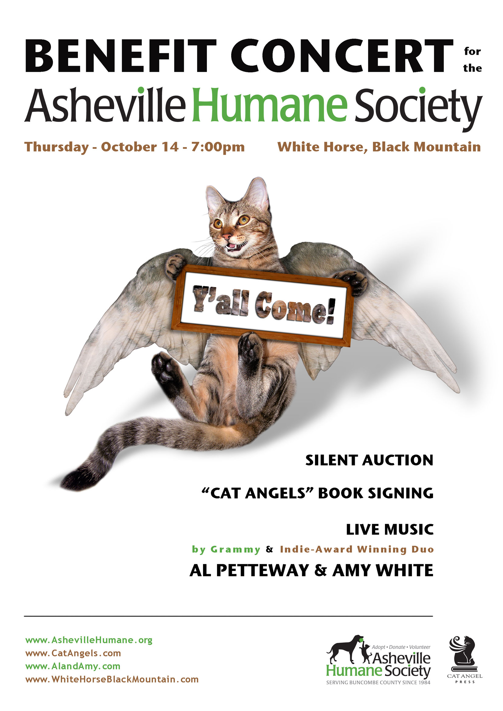 Al Petteway and Amy White will perform a benefit concert for the Asheville Humane Society on Thursday, October 14 at 7:00 PM at the White Horse Black Mountain. 828 669-0816. All net proceeds from ticket sales, all funds from the Silent Auction, and a percentage of book sales will be donated to the cause. It will be an evening of live music, art & good critter-lovin’ fun. See you there!